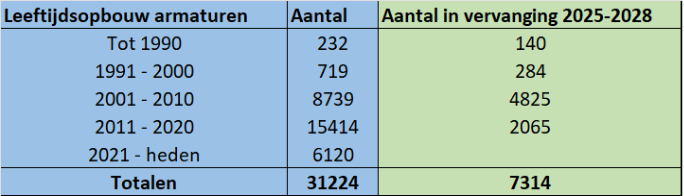 Een goed functionerende openbare verlichting levert een belangrijke bijdrage aan het realiseren van sociale- en verkeersveiligheid. Daarnaast is de verlichting van invloed op de uitstraling van de openbare ruimte. De hoofdelementen van de openbare verlichting zijn de masten, de armaturen en de kabels en kasten. Het beheersysteem laat zien dat er een flink aantal lichtmasten, door het bereiken van de technische levensduur van 40 jaar, aan vervanging toe zijn, echter de technische staat van een deel van deze masten is nog zodanig dat ze in aanmerking komen voor een langere levensduur van 6 tot 10 jaar onder garantie Ook bij de armaturen zullen ivm de technische levensduur van 20 jaar de komende jaren vervangingen plaatsvinden. In de periode 2025 – 2028 zullen dat ruim 7300 stuks zijn. Deze armaturen zullen dan vervangen worden door energiezuinige LED-armaturen.